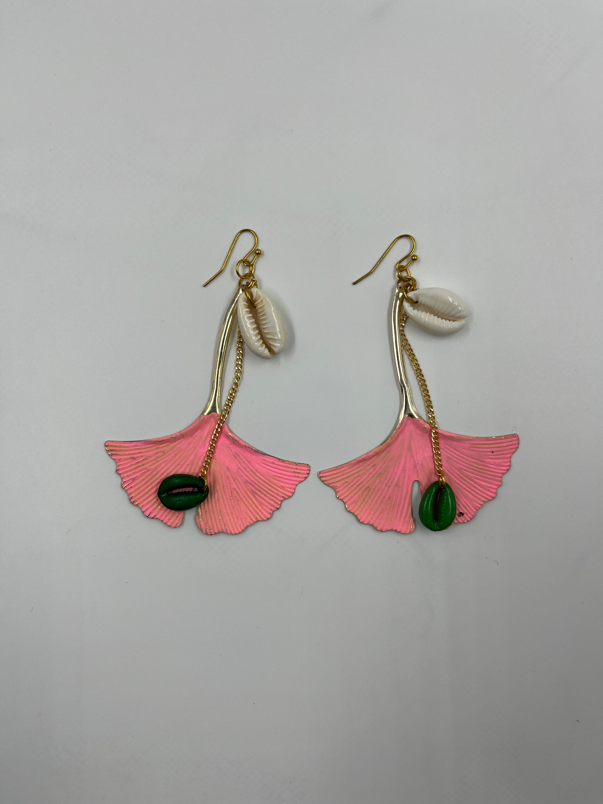 Artistic long drop earrings featuring soft pink leaf-shaped elements paired with delicate chain detailing, finished with shell accents and a deep red drop that adds contrast and movement.