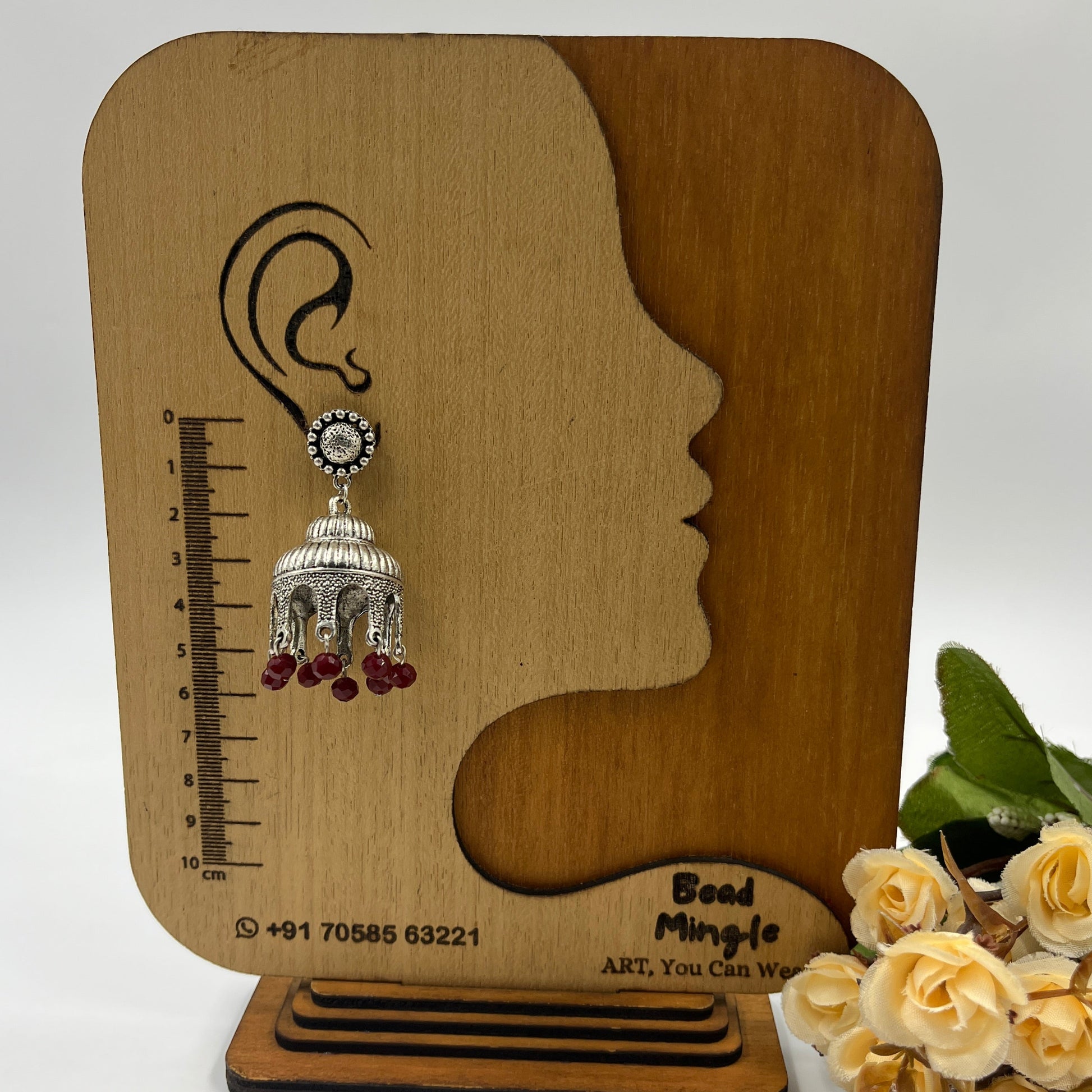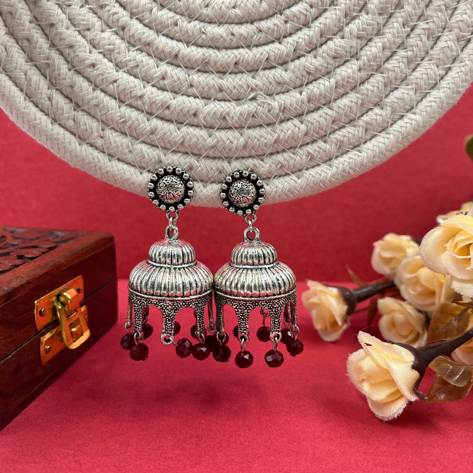 Handcrafted jhumka earrings featuring a classic dome silhouette with detailed silver-tone carving, finished with deep red bead drops that add graceful movement and a traditional touch. A timeless design rooted in ethnic elegance.