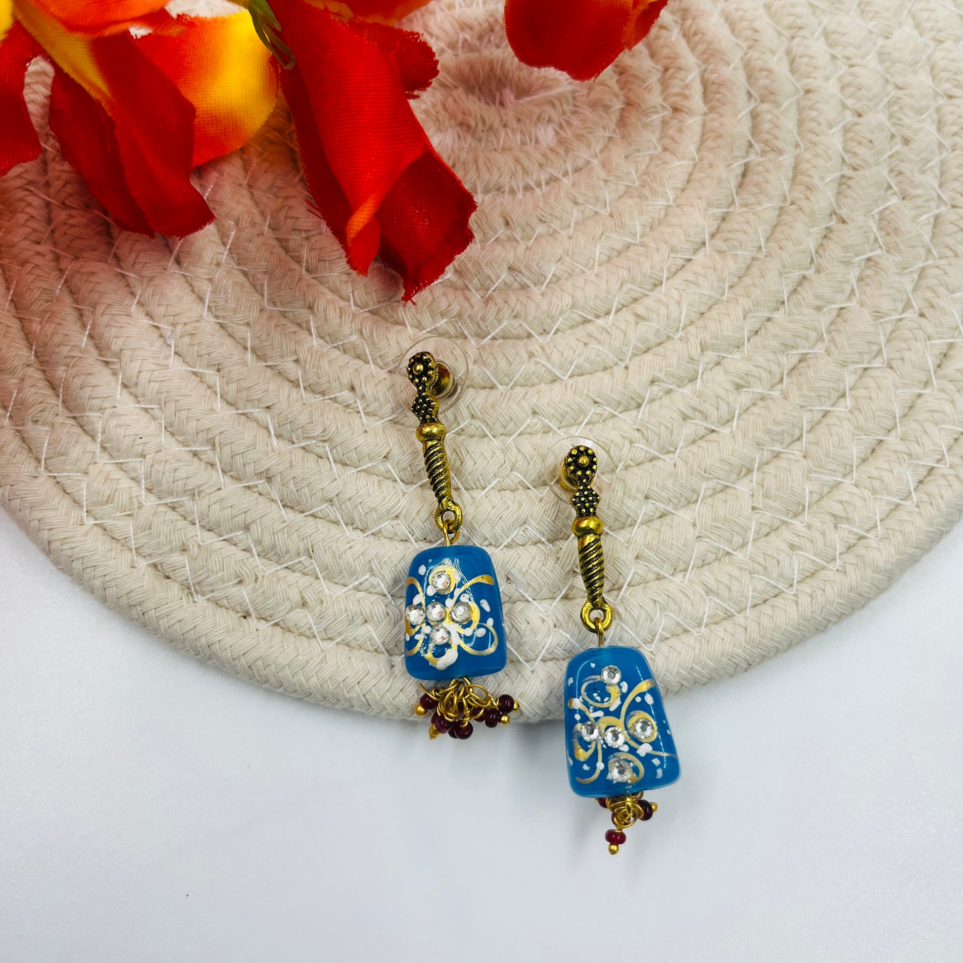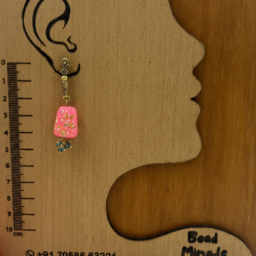 Handcrafted drop earrings featuring a floral-designed rectangular bead with crystal accents and a soft dangling bead cluster. Lightweight and comfortable, these earrings add a graceful touch to everyday and festive looks.