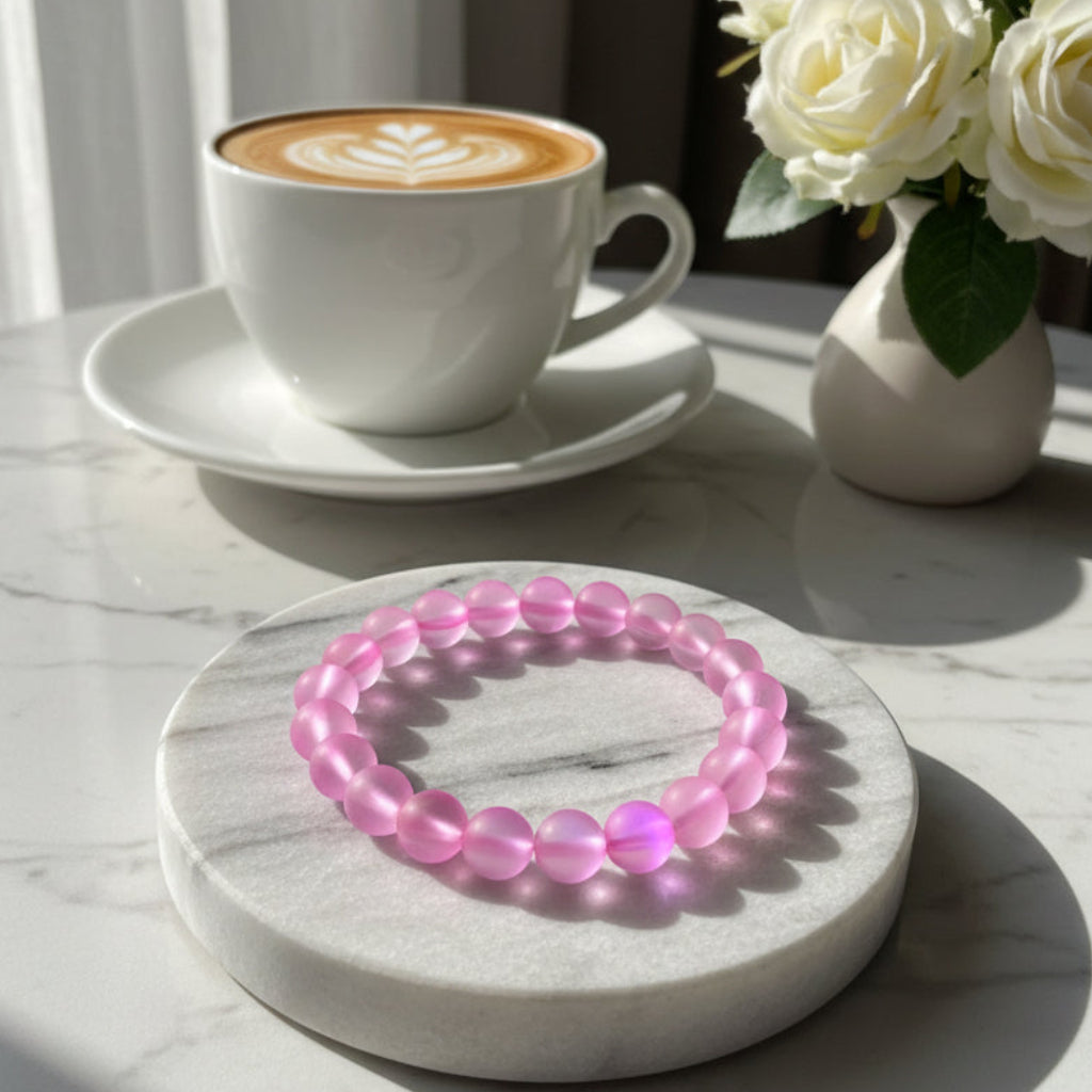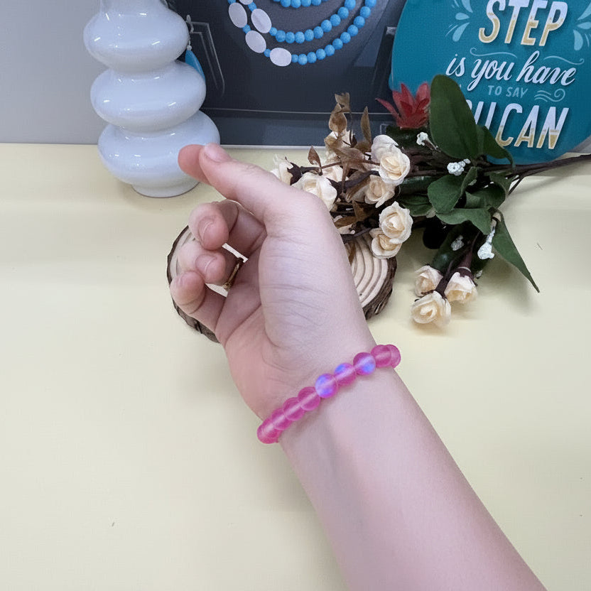 A charming bracelet crafted with 8 mm frosted glass beads in soft rose-pink tones, finished with a delicate rainbow aura shimmer that gently reflects light.