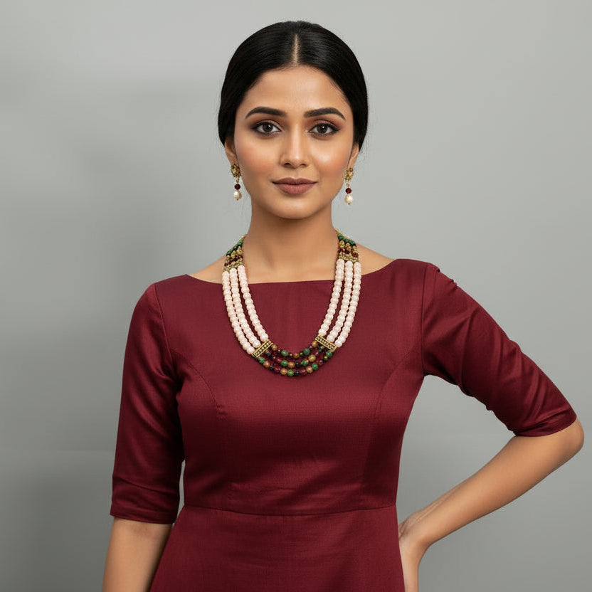 A vibrant layered necklace featuring peach crystals paired with beige, maroon, moss-green, and black crystals at the center. Golden spacers add symmetry and elegance. Completed with matching peach crystal earrings for a polished finish.