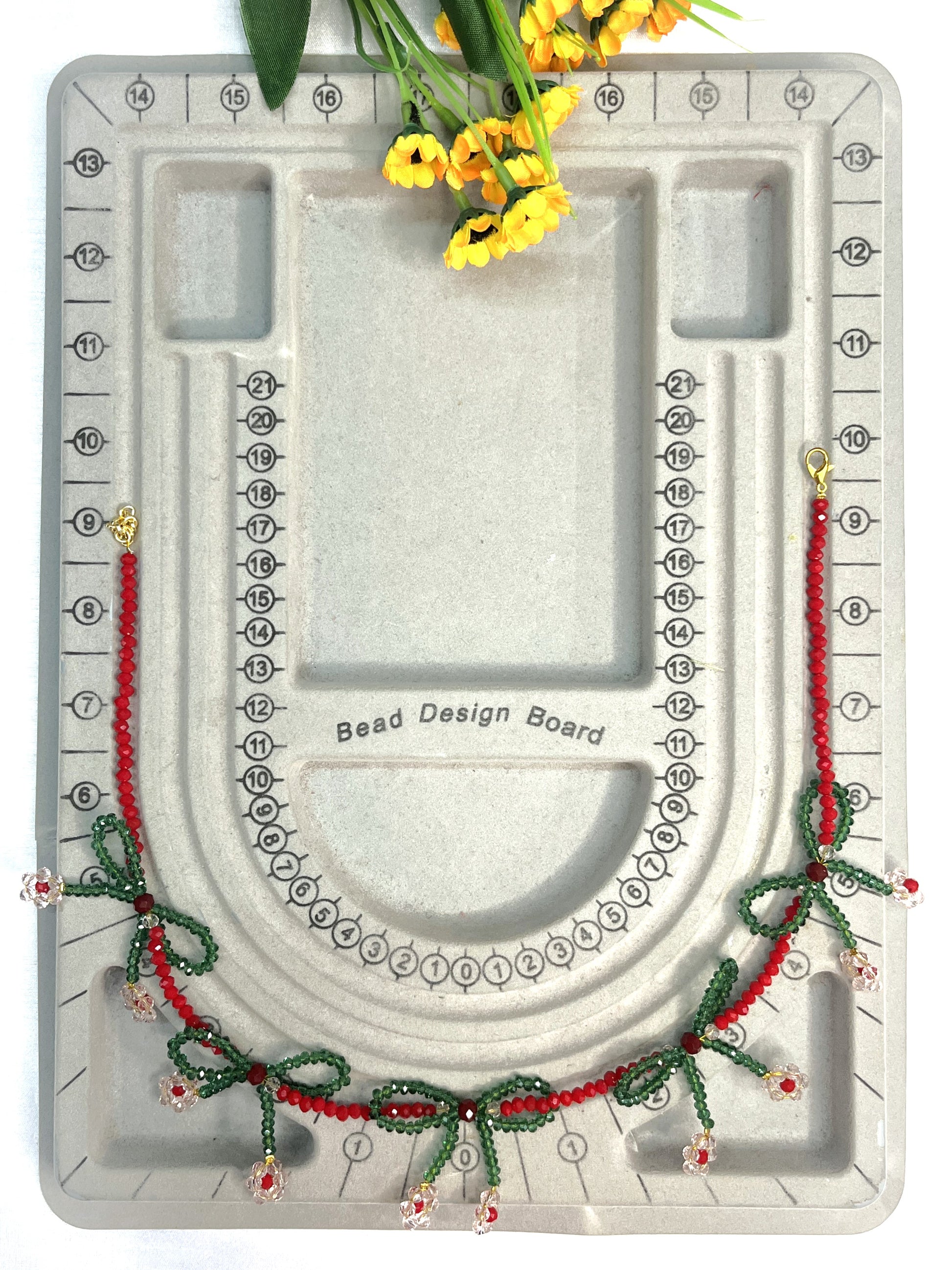A bow-style choker crafted with red crystal beads, featuring green bow accents and light pink floral detailing.