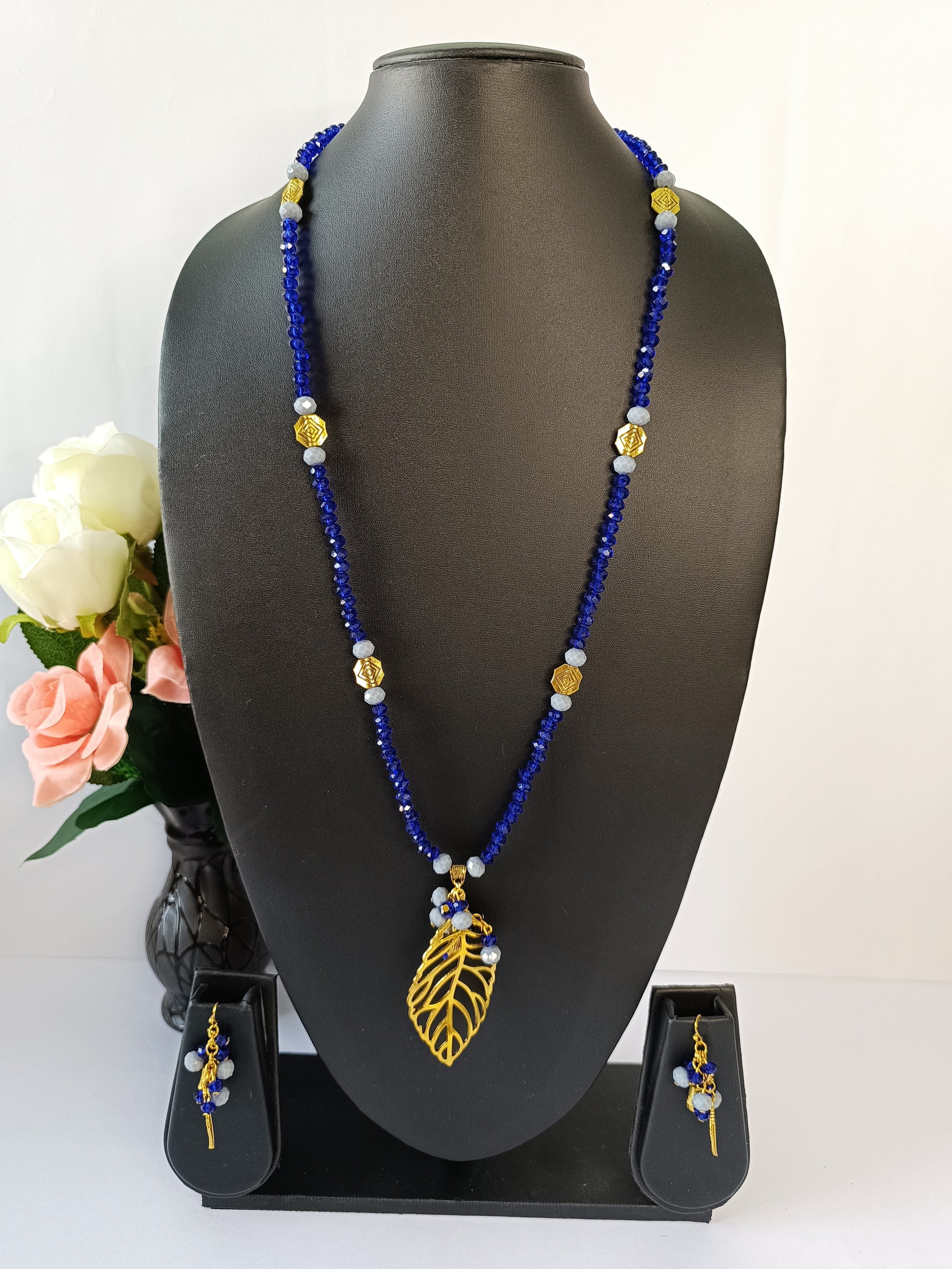 A refined opera-length necklace combining blue and grey crystal beads with a beautifully detailed leaf pendant. The mix of soft shimmer and golden highlights creates an elegant, statement-worthy look. Paired with matching earrings for a complete finish.