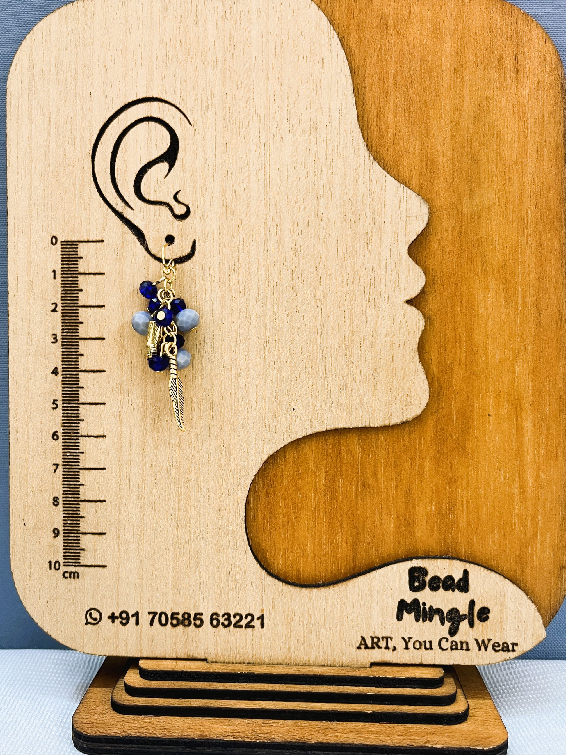 A golden alloy leaf-shaped pendant adorned with vibrant blue and subtle grey crystal beads, finished with delicate golden bead accents.