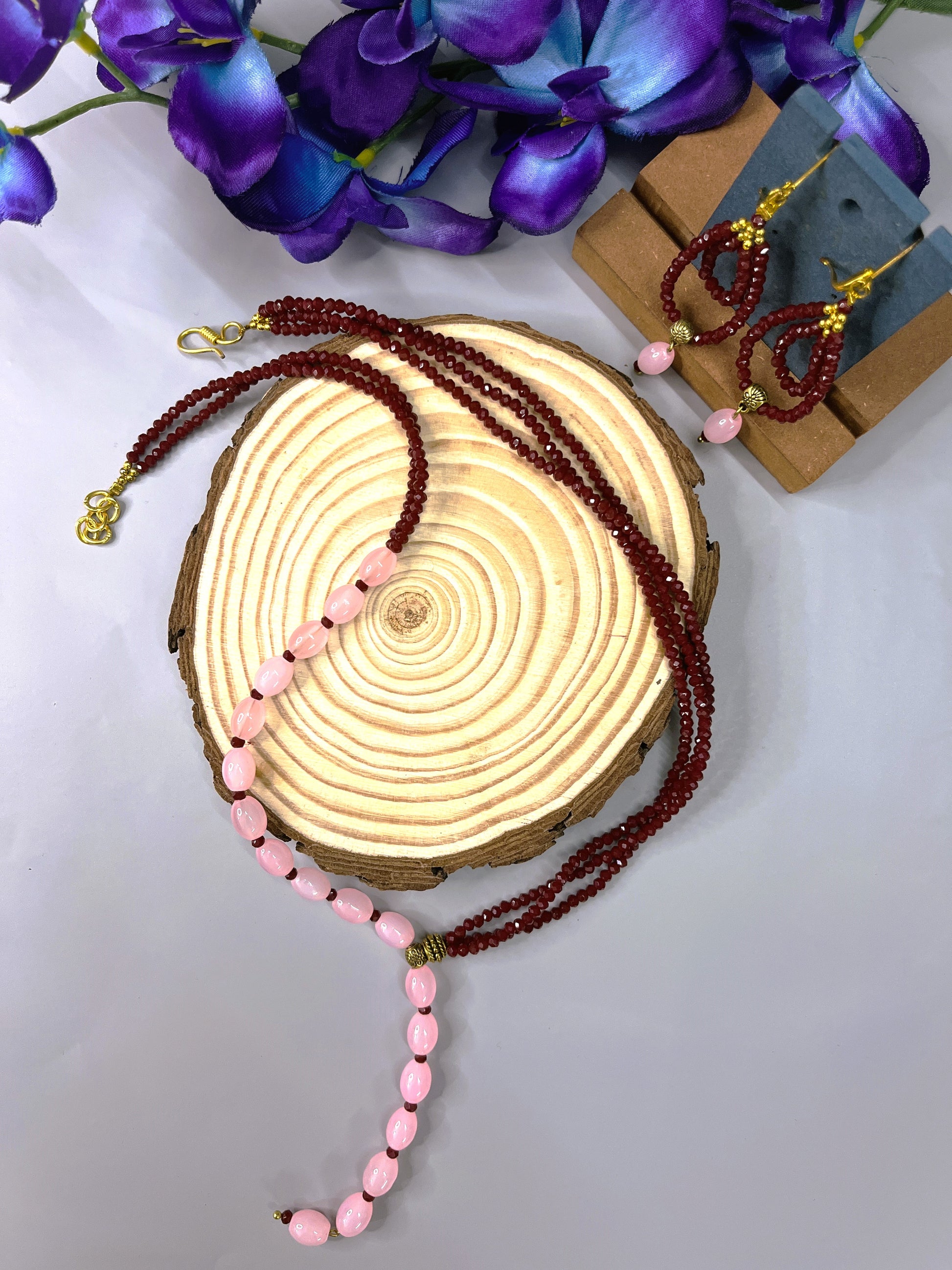 A two-part matinee necklace designed with maroon crystal beads on one side and baby pink oval glass beads on the other.