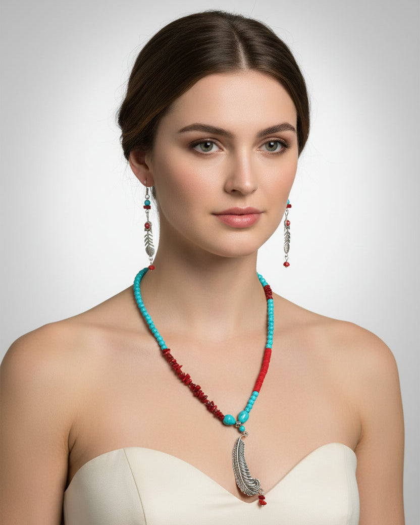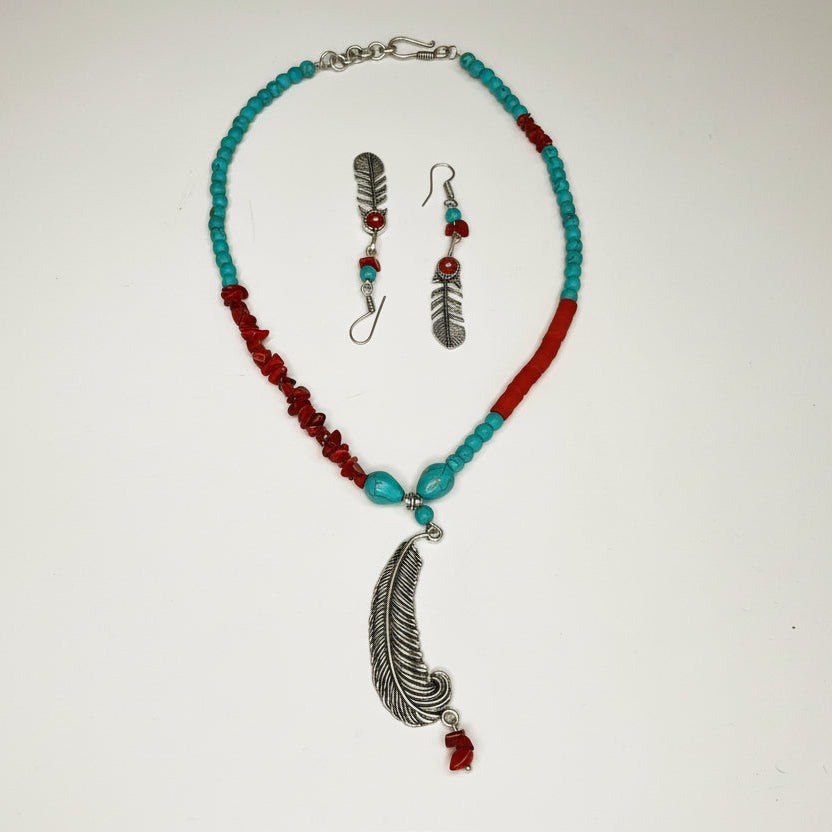 A vibrant necklace combining earthy red uncut beads, sea-blue turquoise, and smooth fomo beads. The silver feather pendant creates a stylish artistic touch. Completed with matching earrings for a polished, coordinated look.