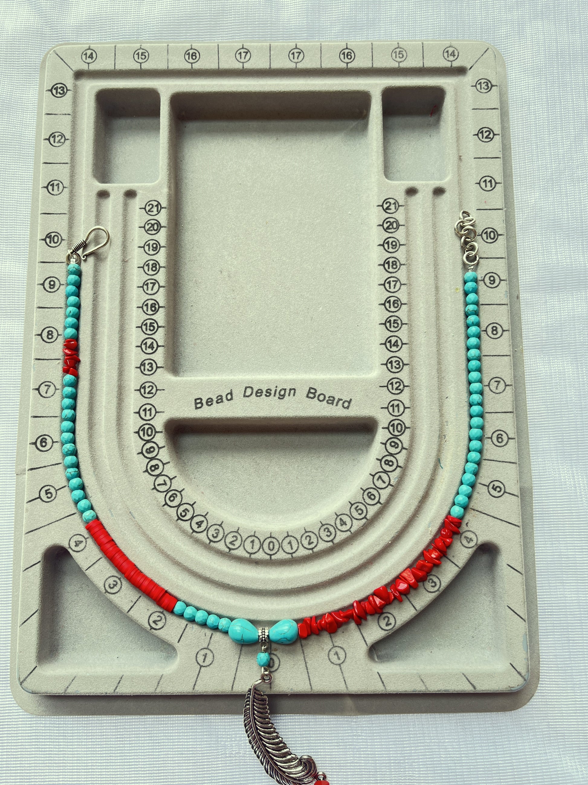 Fomo beads, semi-precious uncut red beads, turquoise beads, silver alloy feather pendant with silver metal plating.