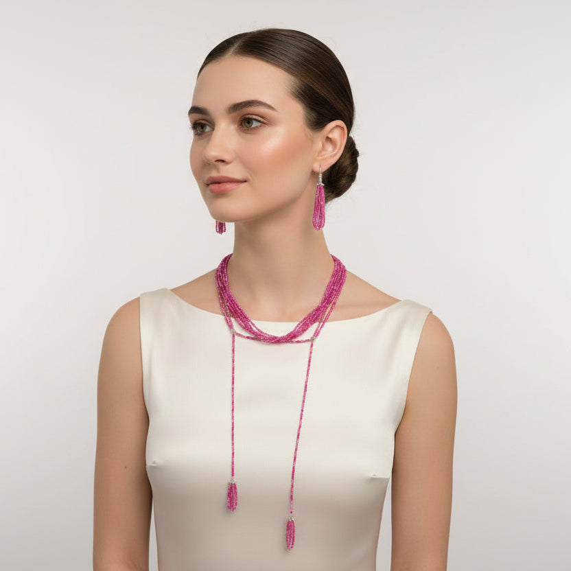 A stylish necklace featuring a rich blend of bright pink and baby pink hydro beads arranged in a smooth, elegant sequence with a star charm. The layered bead detailing creates a bold yet feminine look, finished with matching earrings for a coordinated, polished style.