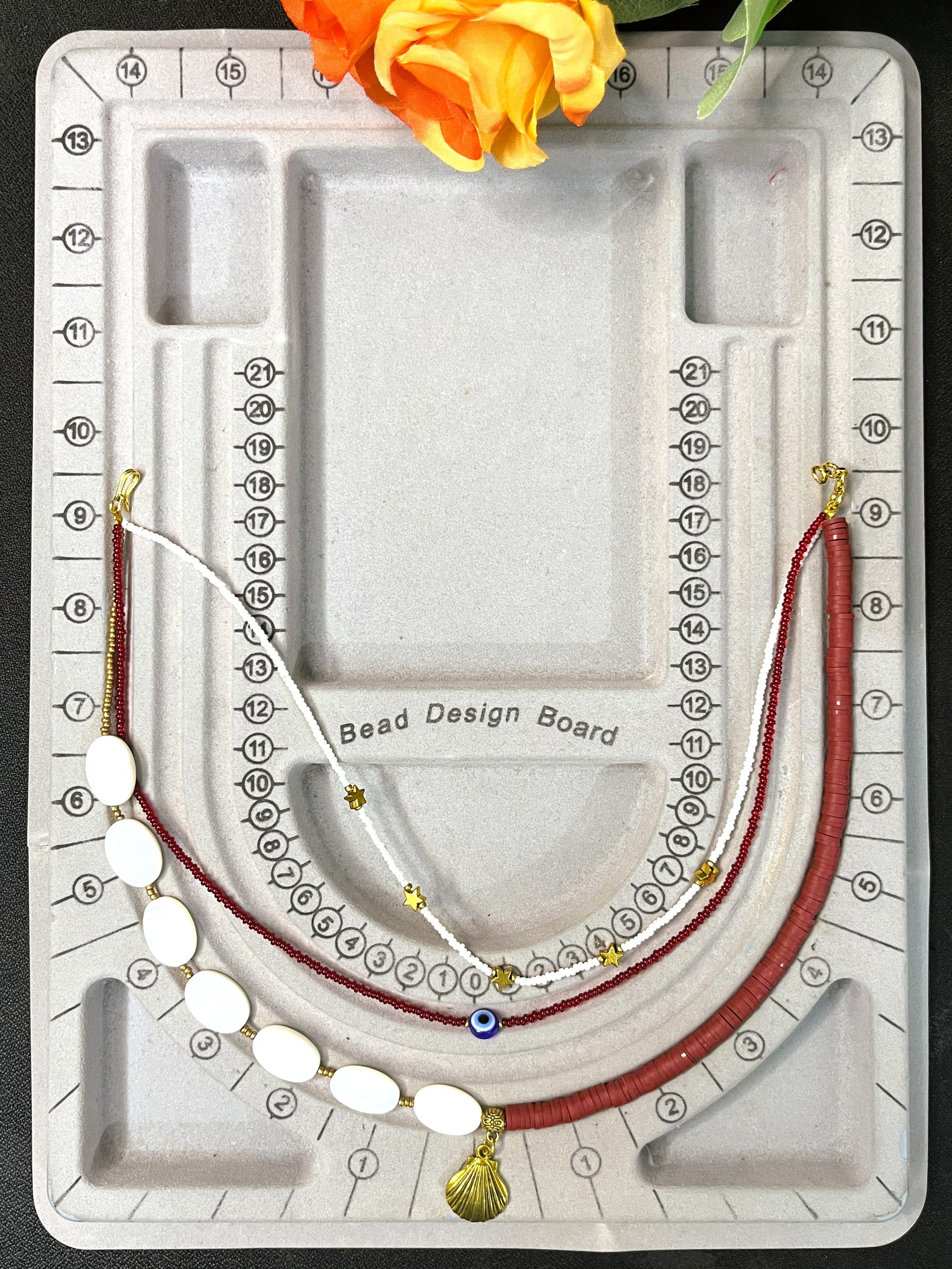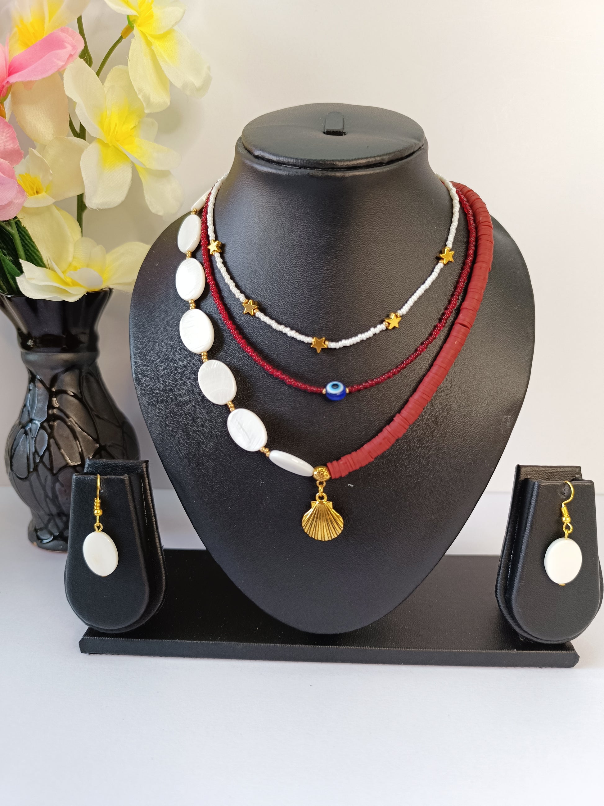 A stylish layered necklace featuring white seed beads with star charms, bold parry red beads paired with an evil eye charm, and a third layer mixing fomo and mother-of-pearl beads with golden charms. The combination of textures and charms creates a trendy, fashionable look. Completed with matching earrings for a coordinated finish.