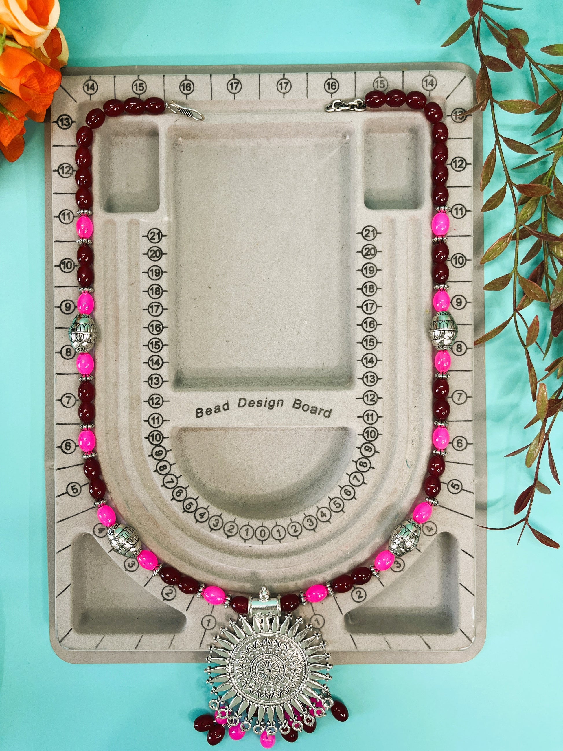 A vibrant opera necklace featuring bold pink and red oval beads paired with elegant silver accents. The alloy pendant and central silver bead elevate the design, creating a striking yet graceful statement piece. Comes with matching earrings for a coordinated look.