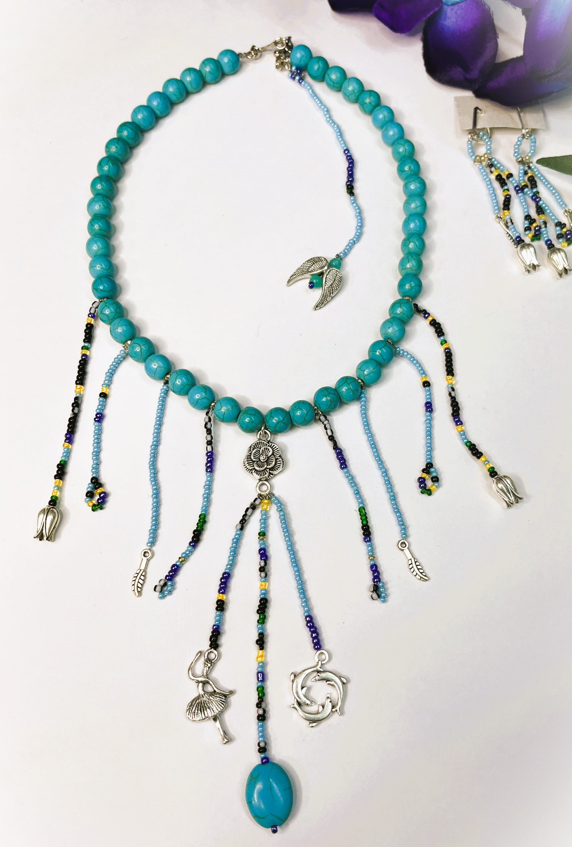 A striking necklace featuring bright firoza beads paired with a handcrafted latkan adorned with delicate seed bead charms. The bold colors and artistic detailing create an expressive, statement look. Completed with matching earrings for a cohesive finish.