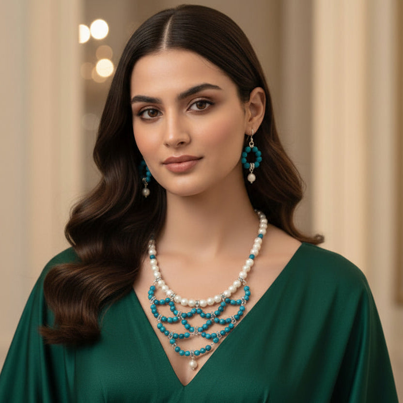 A striking necklace featuring natural semi-precious agate beads, known for their smooth finish and subtle natural patterns. The classic white agate base adds purity and elegance, while the vibrant sea-blue agate chandelier layer brings a refreshing, eye-catching contrast. The layered craftsmanship highlights the natural sheen and quality of the stones. Completed with matching earrings for a refined, coordinated look.