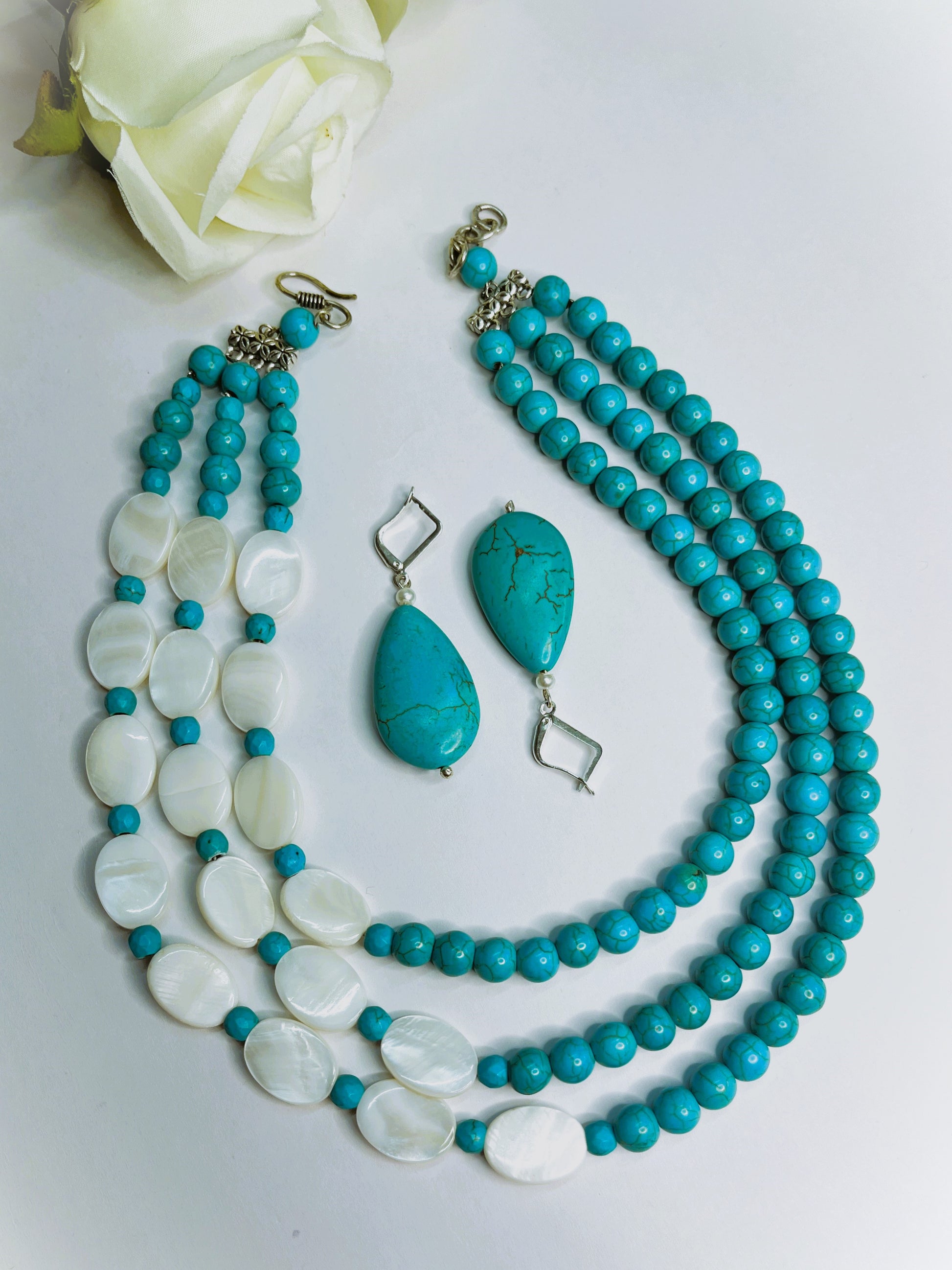 A refined design featuring layered turquoise beads enhanced with asymmetrical mother-of-pearl elements for a modern touch. The iridescent and aqua tones blend effortlessly, creating a timeless, stylish look. Completed with matching turquoise drop earrings.