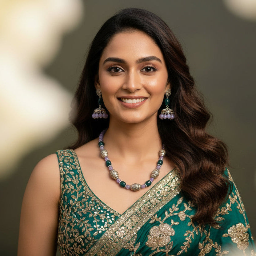 A refined necklace blending soft lavender agate with bold peacock green square beads, highlighted by silver spacers and oval accents. The upper strand is fully lavender with a cotton tassel closure. Comes with handmade jhumkas for a graceful look.