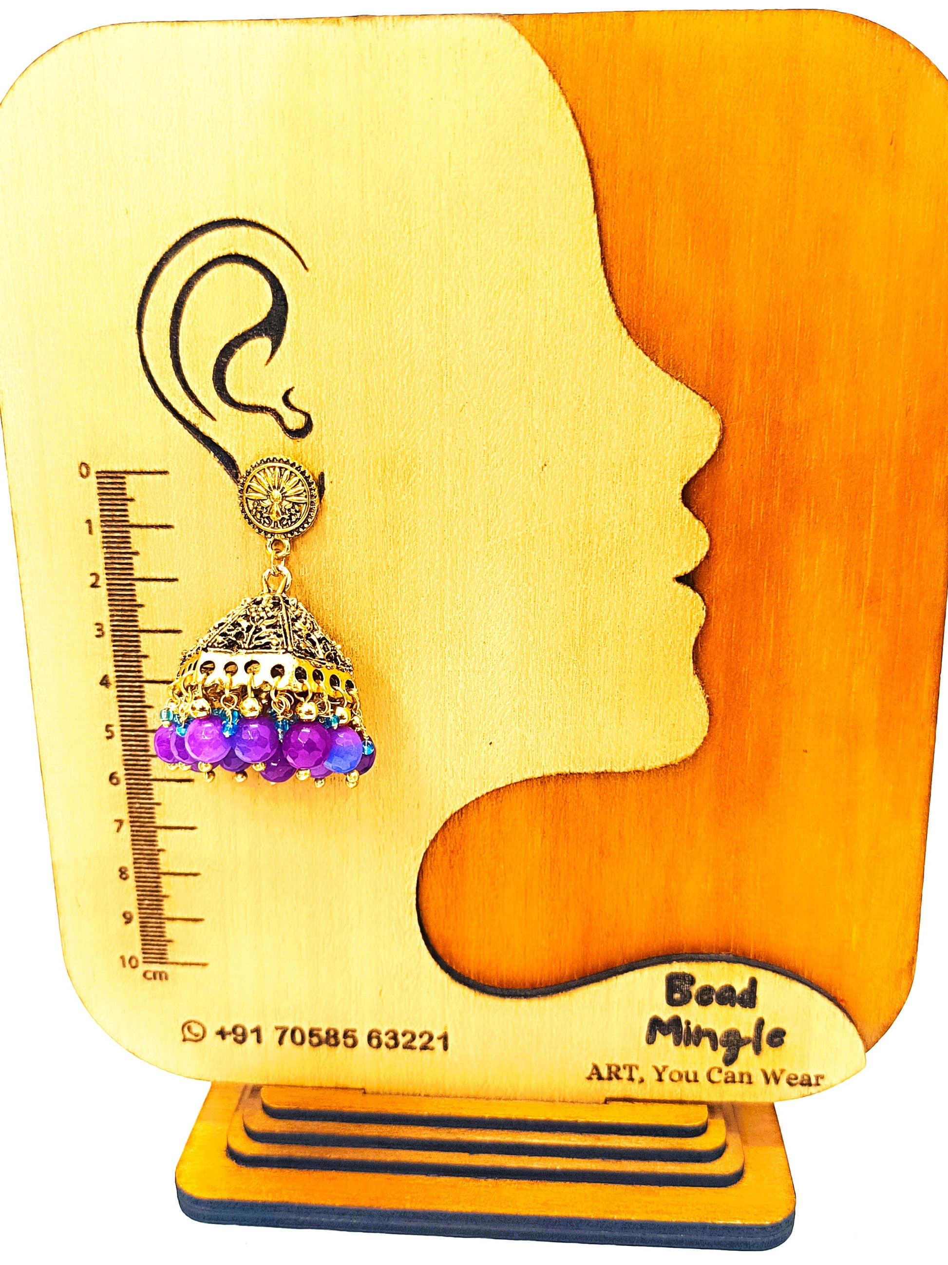 A majestic multilayer necklace featuring golden Om beads, multicolor stone pearls, blue coracao agate, and dark lavender accents. Designed with bead caps, seed beads, and golden spacers for rich traditional detailing. Completed with golden jhumka earrings for a regal finish.
