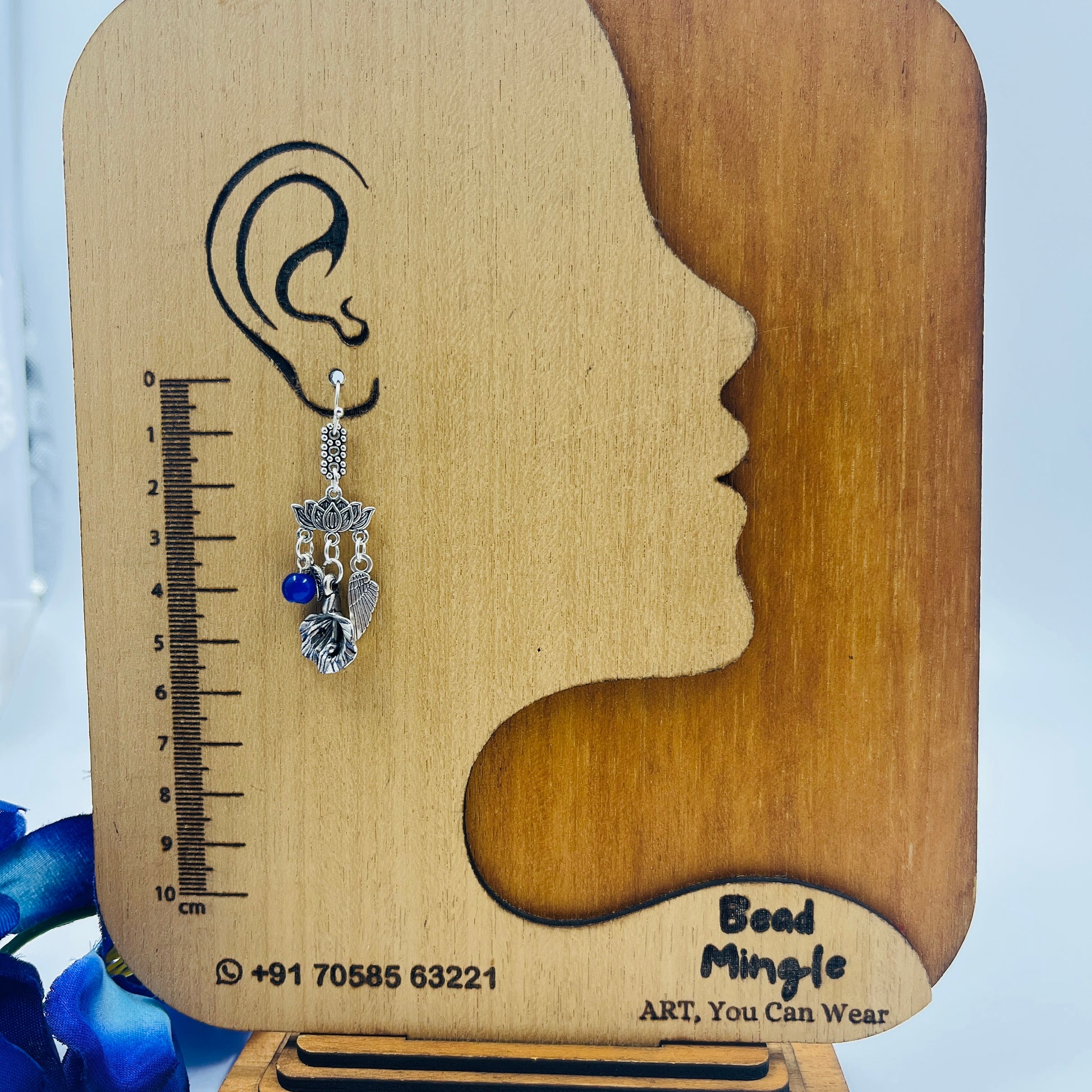 Delicate minimal earrings featuring a lotus-inspired top, layered leaf and shell charms, and a soft blue bead accent that adds subtle contrast and movement.