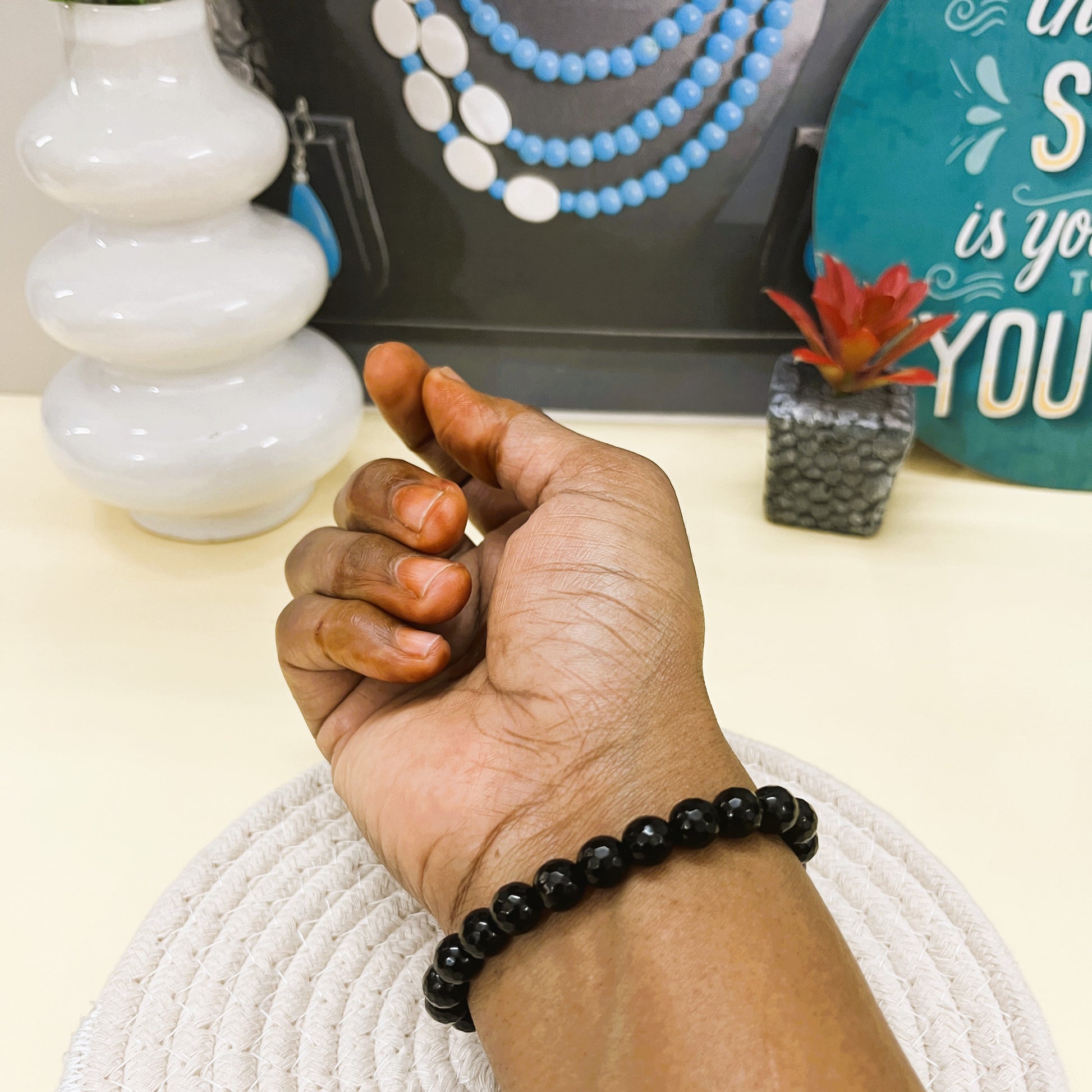 A bold bracelet crafted with faceted 8 mm Black Onyx Agate gemstone beads, offering a sleek, polished look with subtle sparkle for confident everyday wear.