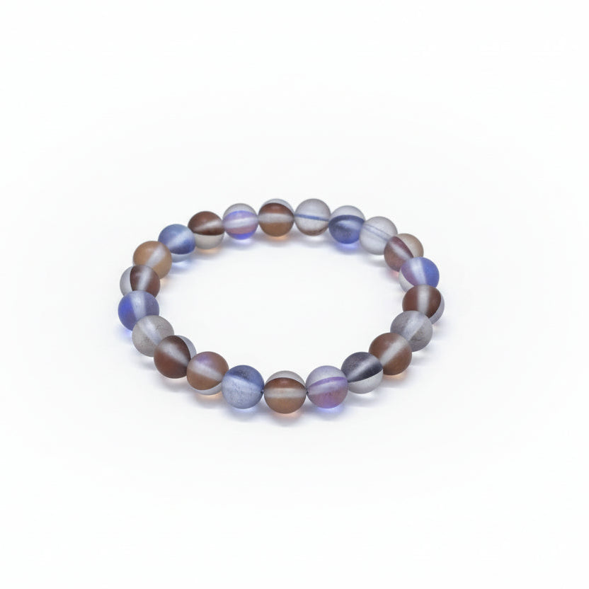 A sleek bracelet crafted with smoky grey glass beads, finished with a blue-violet aura coating that creates a soft, mysterious glow and a modern, elegant everyday look.